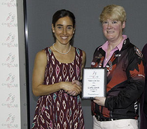 Shelly Doucet (G) présente à Marcie Holland le prix Coureuse émergente de l'année 2015. [Photo de: Gilles Gautreau] |